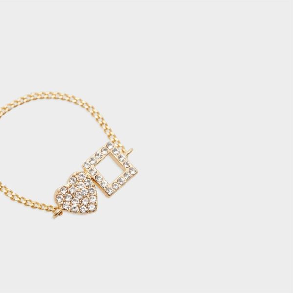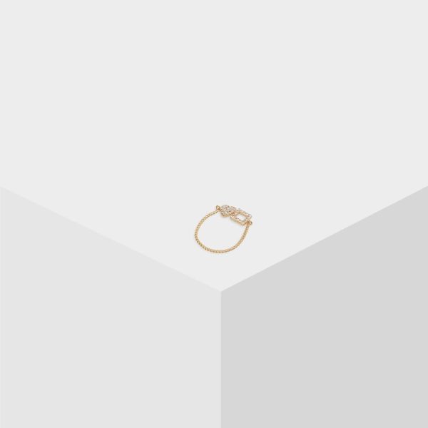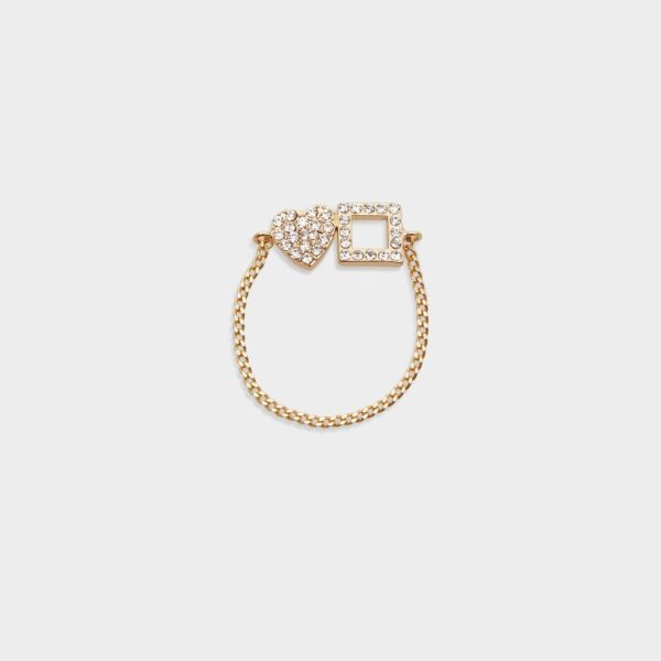 Anillo de cadena fino bañado en oro adornado con un corazón y un cubo formados por critales en pavé.