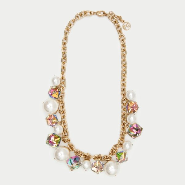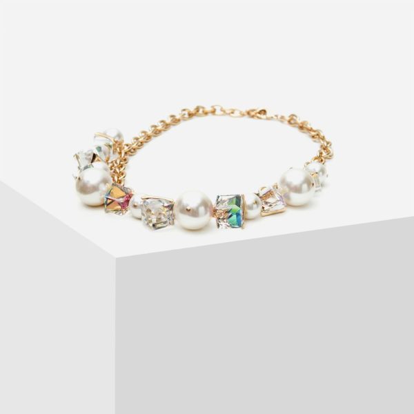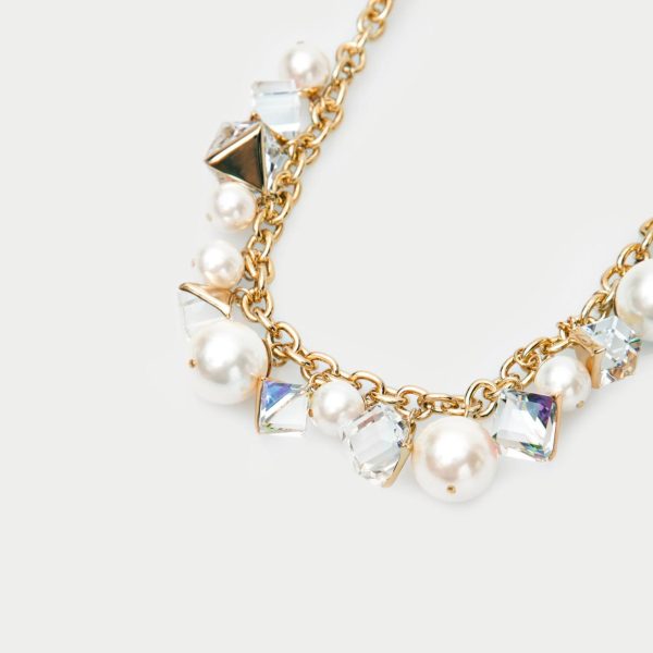 Collar corto formado por una cadena gruesa color oro adornada con perlas y cristales en forma de cubo, personalizado con logo PG en el cierre.