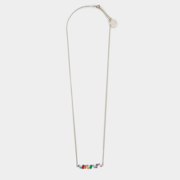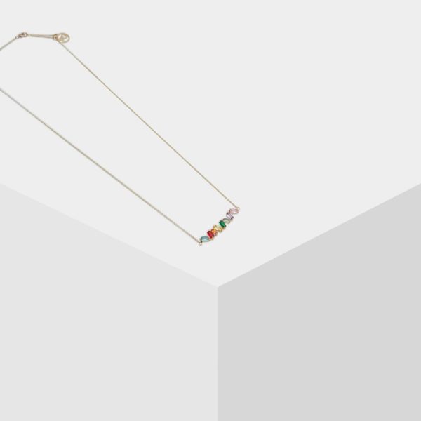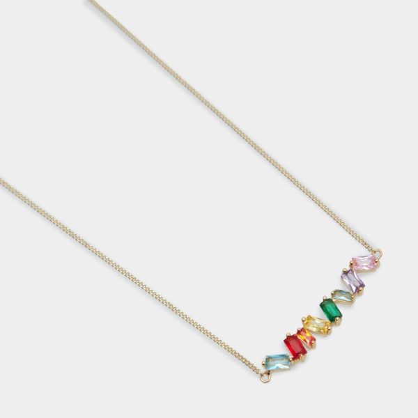 Collar corto bañado en oro con colgante formado cristales multicolor de forma rectangular. Cadena fina con cierre de mosquetón de tres posiciones y acabada con logo PG.