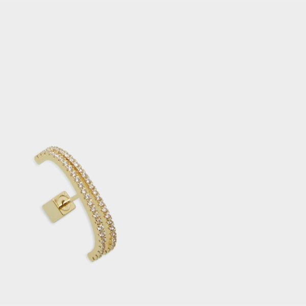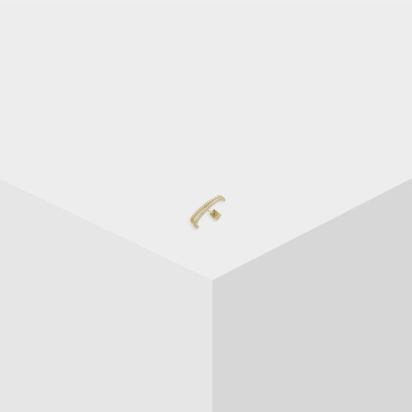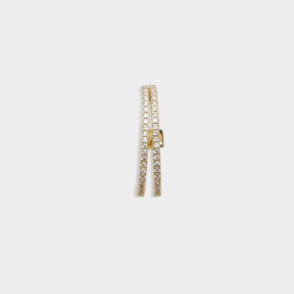 Pendiente ear cuff bañado en oro con diseño de dos bandas con incrustaciones de cristales pequeños. Cierre de tuerca a presión en forma de cubo PG.