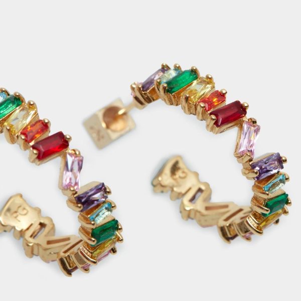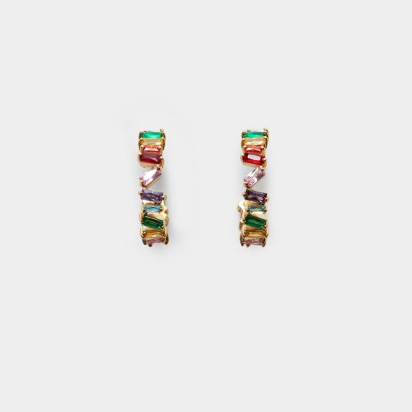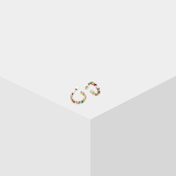 Pendientes de aro bañados en oro con cristales multicolor de forma rectangular. Cierre con tuerca a presión en forma de cubo grabado con logo PG.