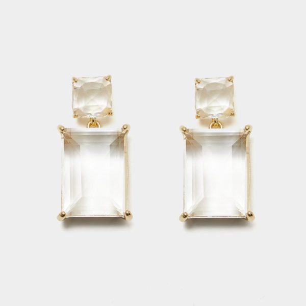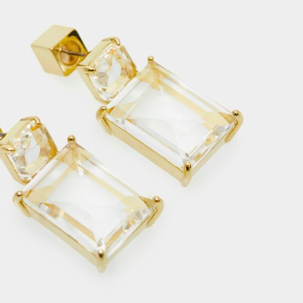 Pendientes con dos cristales, uno pequeño en forma de cubo y otro más grande con forma rectangular, engarzados en piezas bañadas en oro.