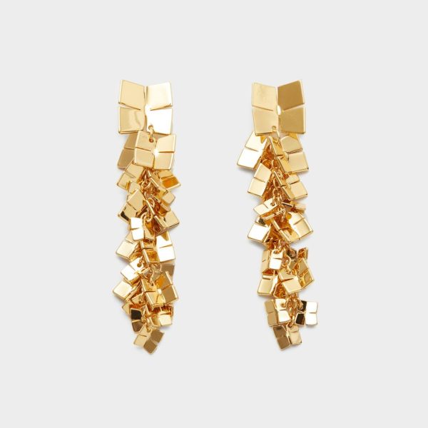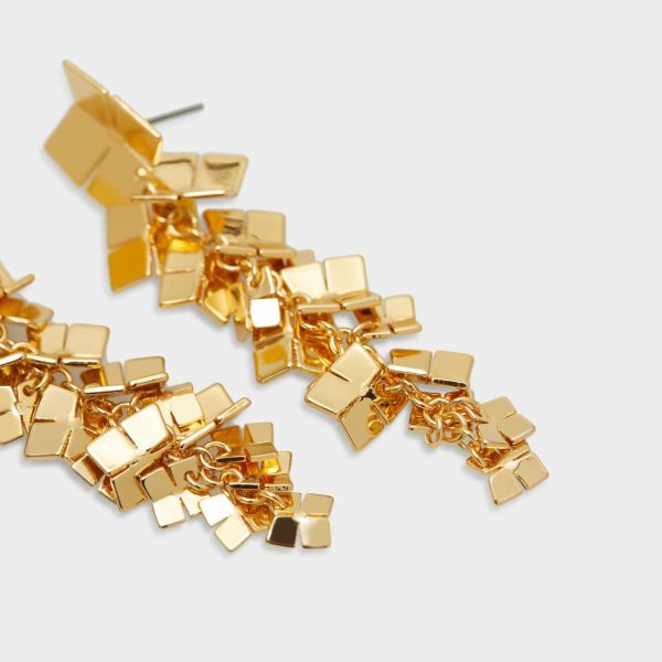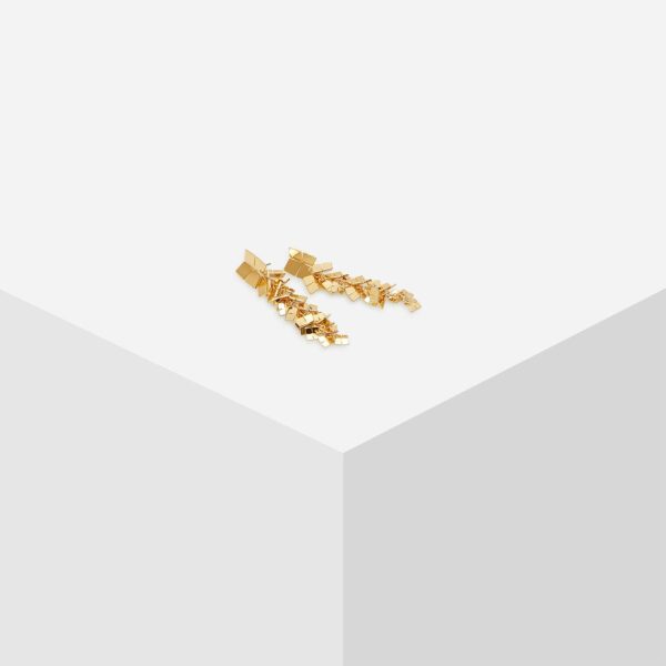 Pendientes largos bañados en oro formados por un juego mariposas geométricas en forma de cubo. Cierre con tuerca a presión en forma de cubo.