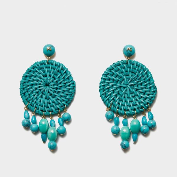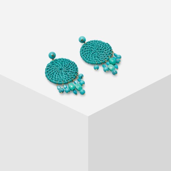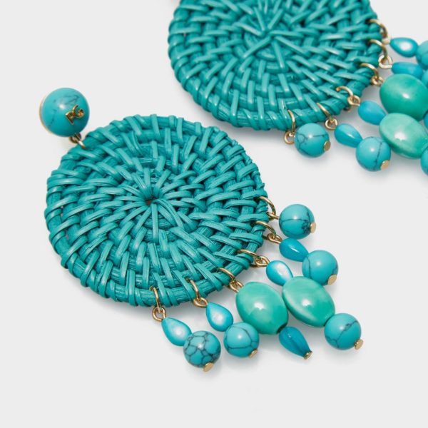 Pendientes formados por círculo de rafia turquesa trenzada con detalles de cuentas de cristal y cerámica a tono.