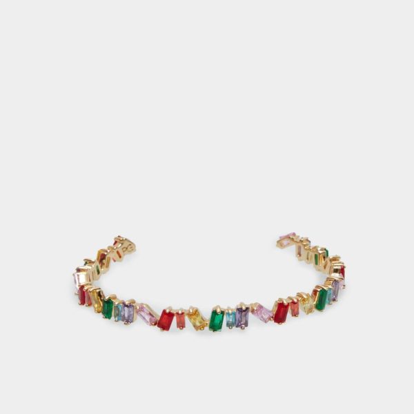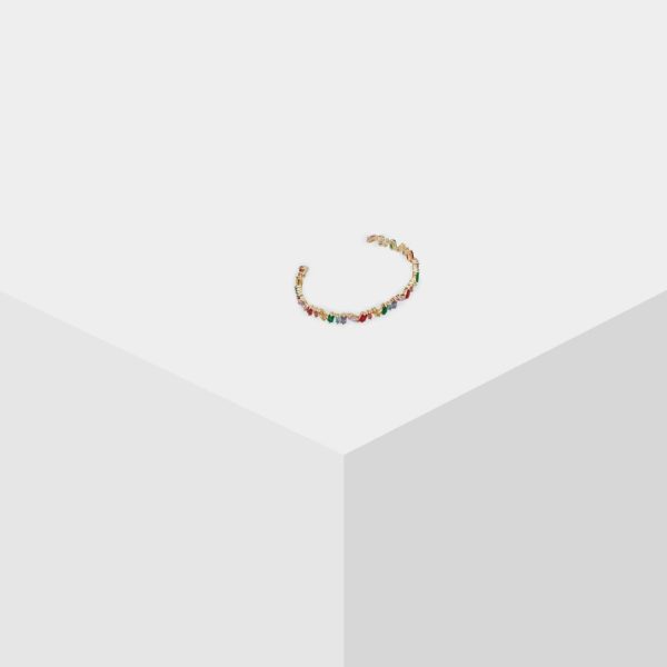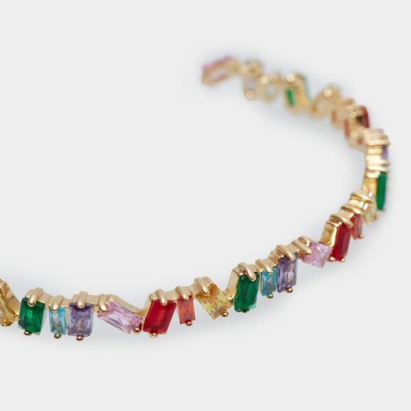 Pulsera rígida bañada en oro con cristales multicolor de forma rectangular.
