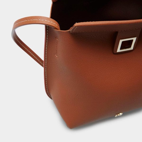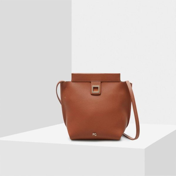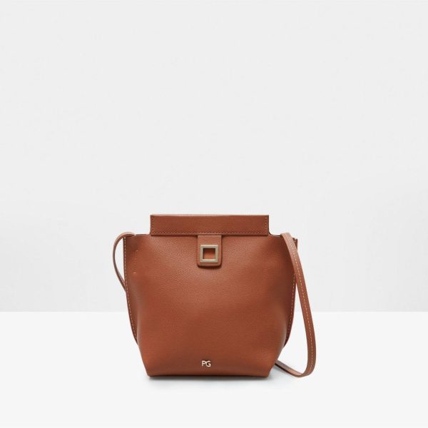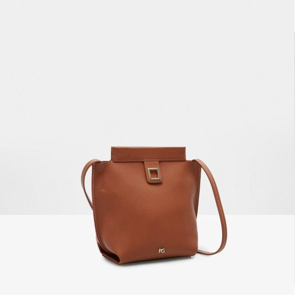 Bolso bandolera en piel marrón con detalle de metálica en forma de cubo. Cierre con imán oculto e interior en piel con un bolsillo de parche.
