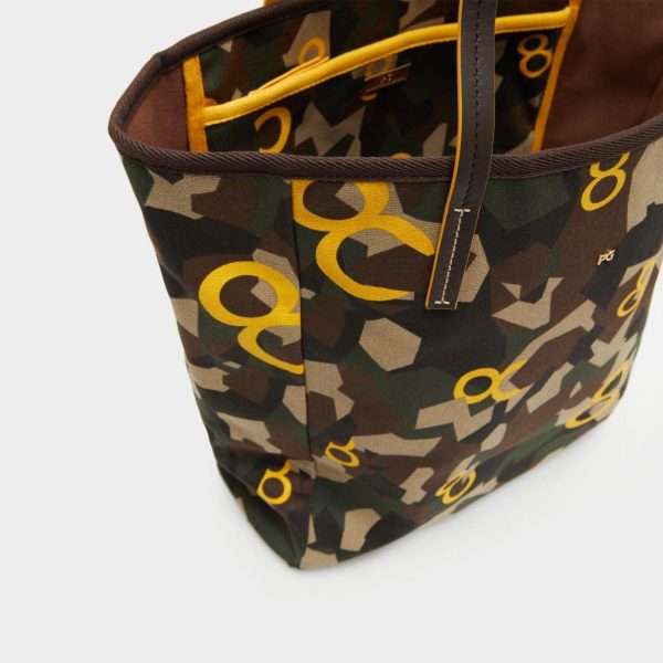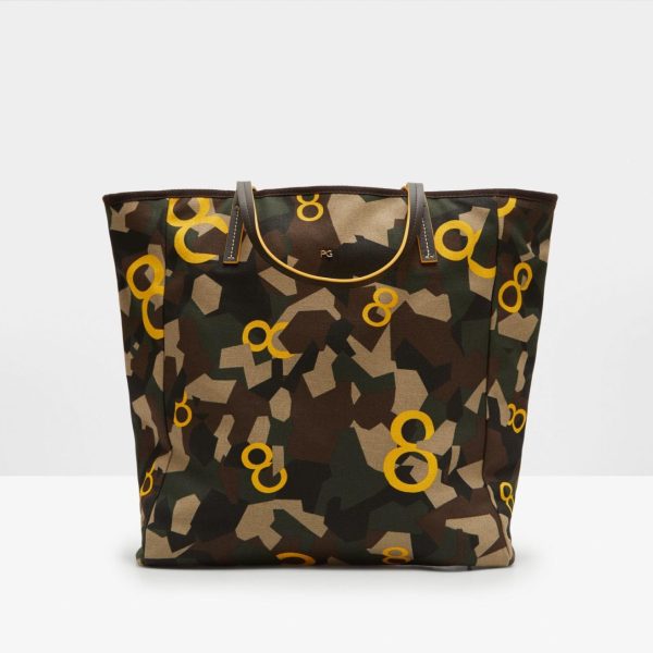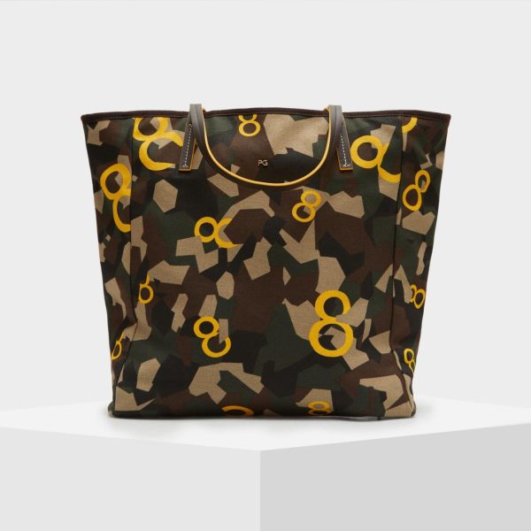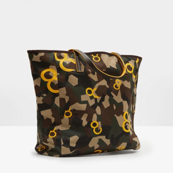 Bolso confeccionado en algodón con estampado de camuflaje geométrico y ochos PG a contraste. Doble asa de hombro en piel y detalle de metálicas PG.