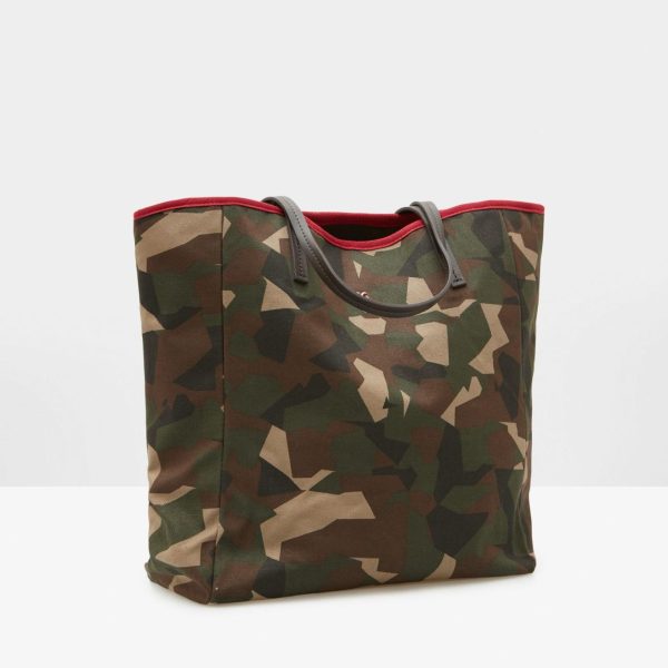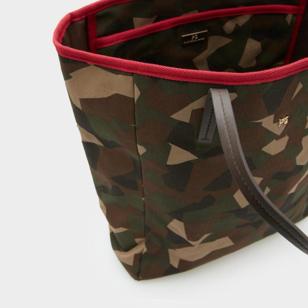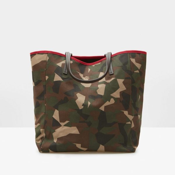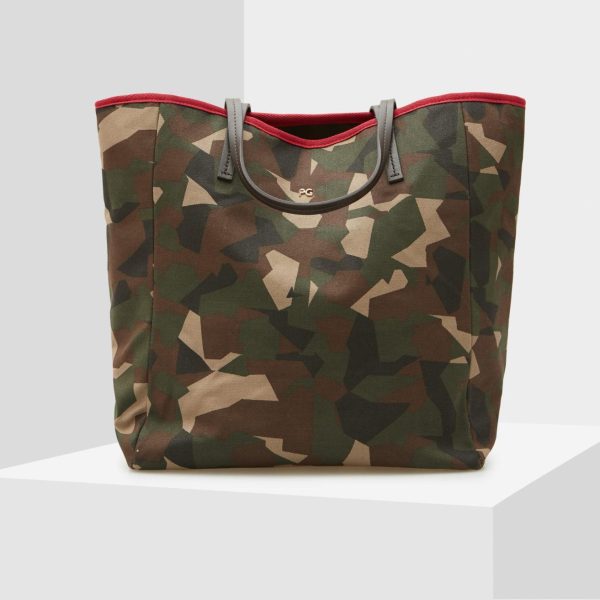 Bolso confeccionado en algodón con estampado de camuflaje geométrico. Doble asa de hombro en piel y detalle de metálicas PG.