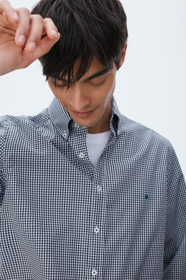 Camisa regular fit en popelín de algodón con diseño de micro cuadro vichy. Cuello abotonado, puño simple y logo de cubo bordado a la altura del pecho. El modelo mide 187 cm y lleva una talla 3.