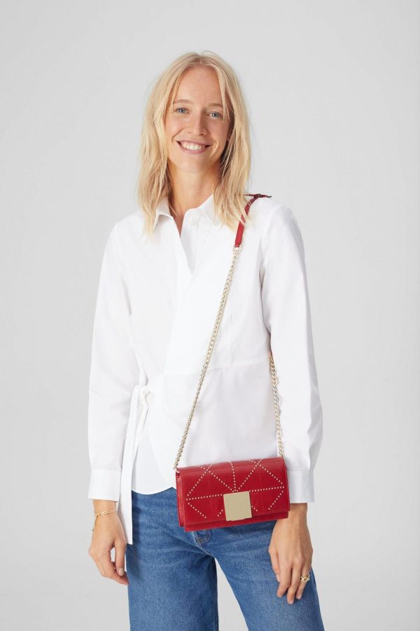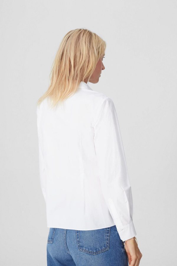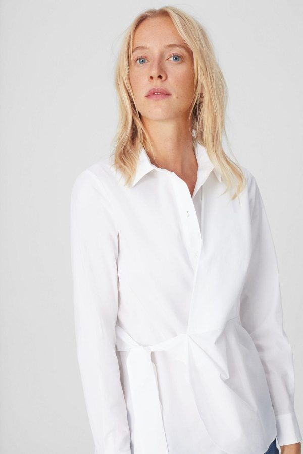 Camisa entallada en popelín de algodón con lazada lateral. La modelo mide 180 cm y lleva una talla 38.