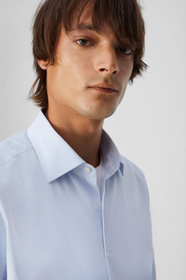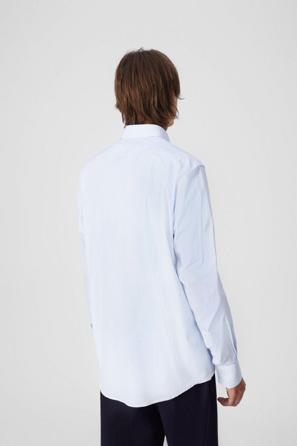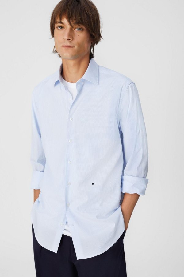 Camisa regular fit con diseño mil rayas de algodón. Cuello italiano, puño simple y logo de cubo bordado en el bajo. El modelo mide 186 cm y lleva una talla 3.