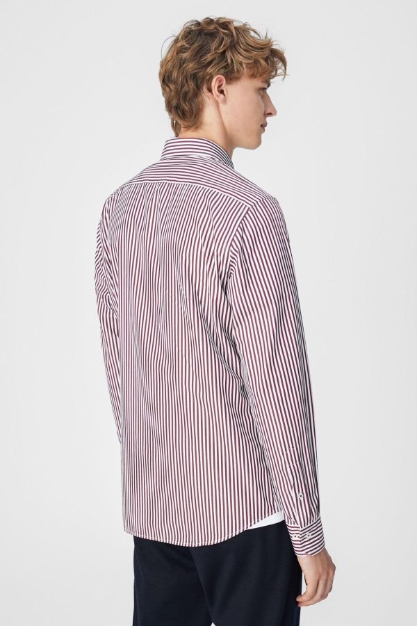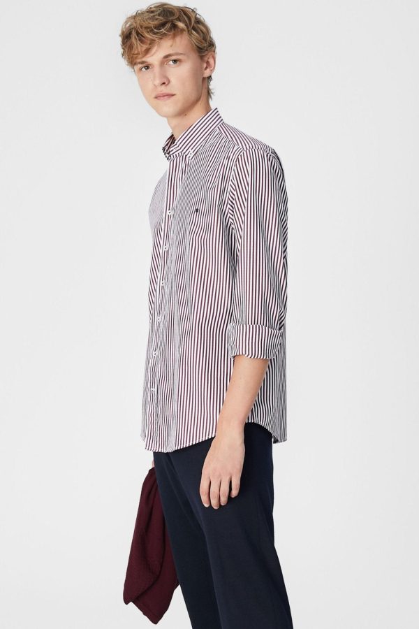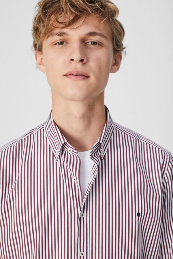 Camisa regular fit en popelín de algodón con diseño de raya candela. Cuello abotonado, puño simple y logo de cubo bordado a la altura del pecho. El modelo mide 187 m y lleva una talla 3.