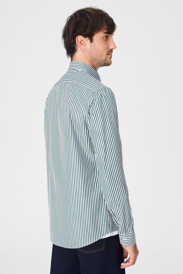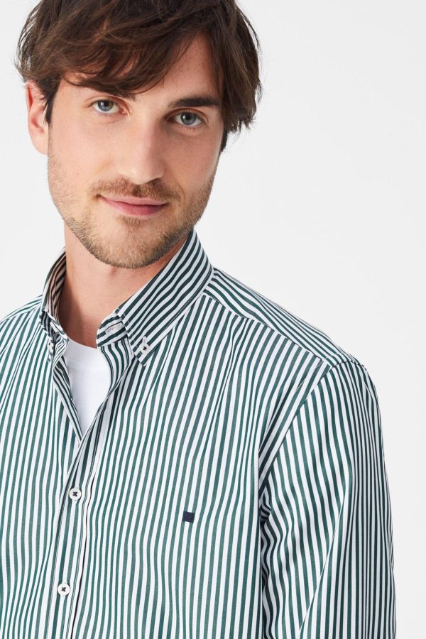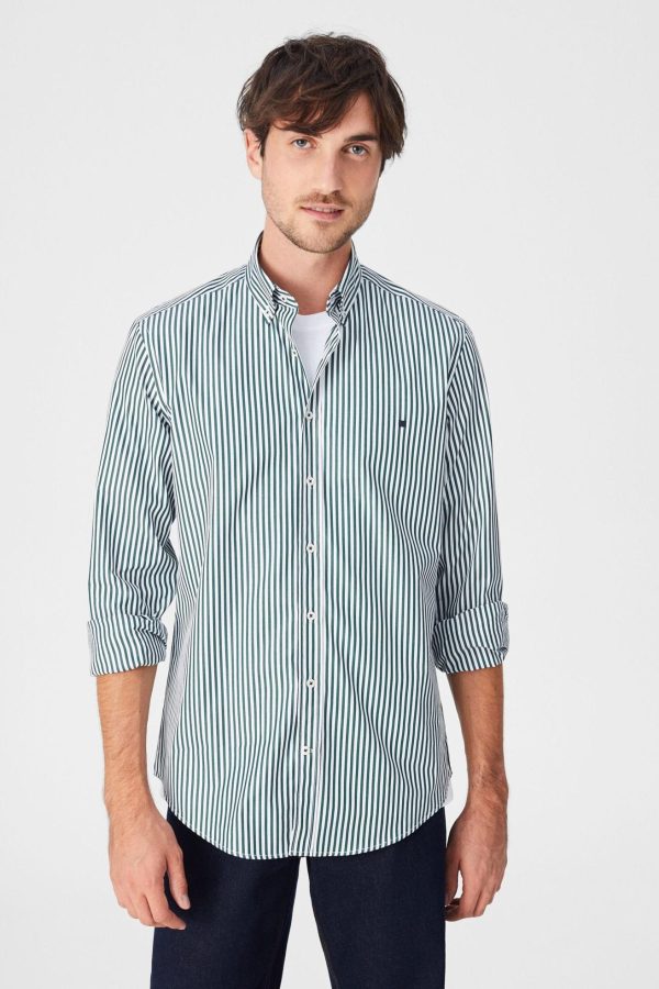 Camisa regular fit en popelín de algodón con diseño de raya candela. Cuello abotonado, puño simple y logo de cubo bordado a la altura del pecho. El modelo mide 187 m y lleva una talla 3.