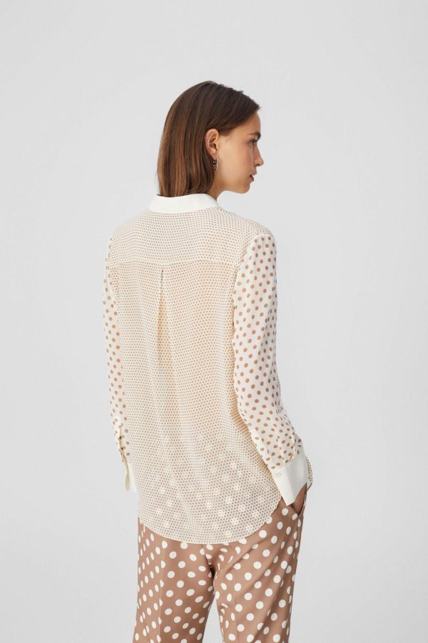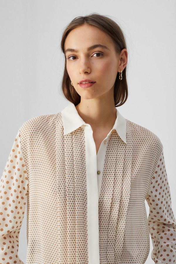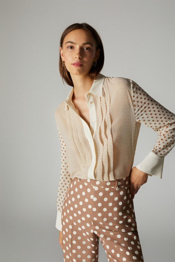 Camisa fluida de crepé georgette con estampado de lunares y tablas en el delantero.cuello camisero y detalle de puños anchos. La modelo mide 180 cm y lleva una talla 38.