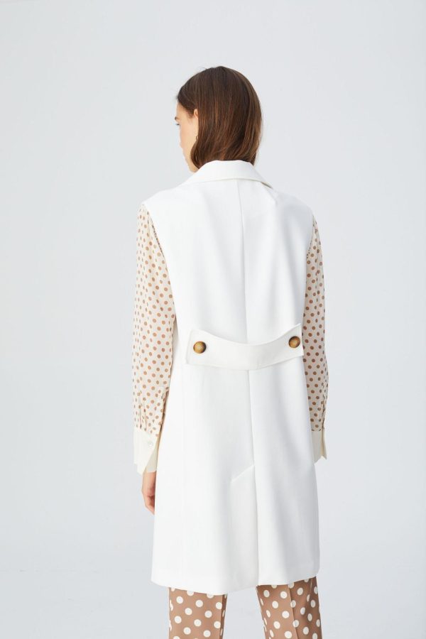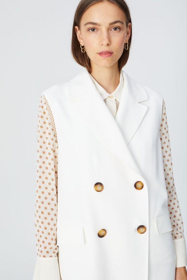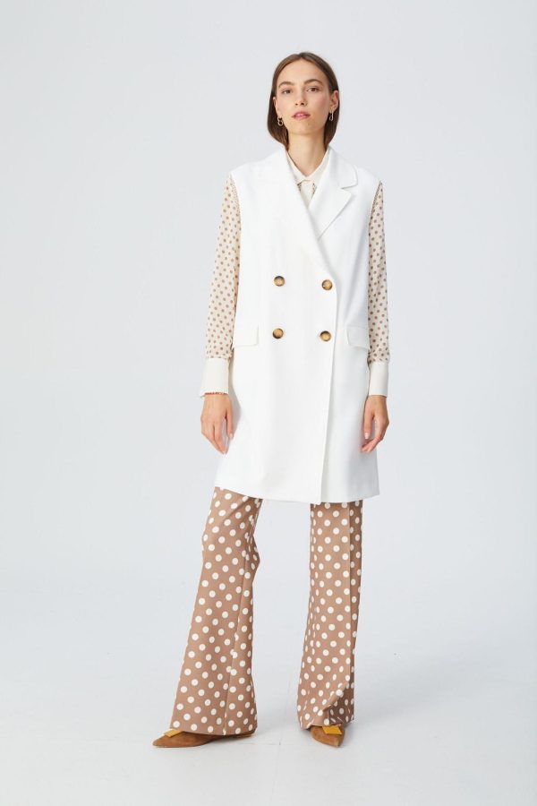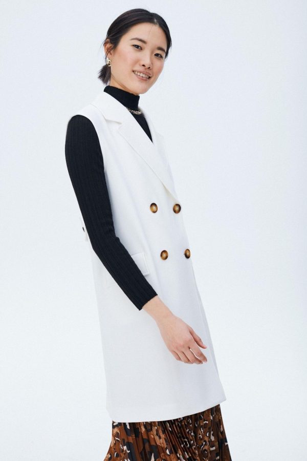 Chaleco largo cruzado en doble tela. Cuello solapa, doble botonadura y bolsillos con tapeta en el delantero. La modelo mide 180 cm y lleva una talla M.