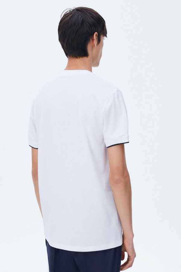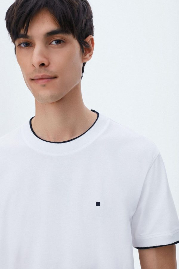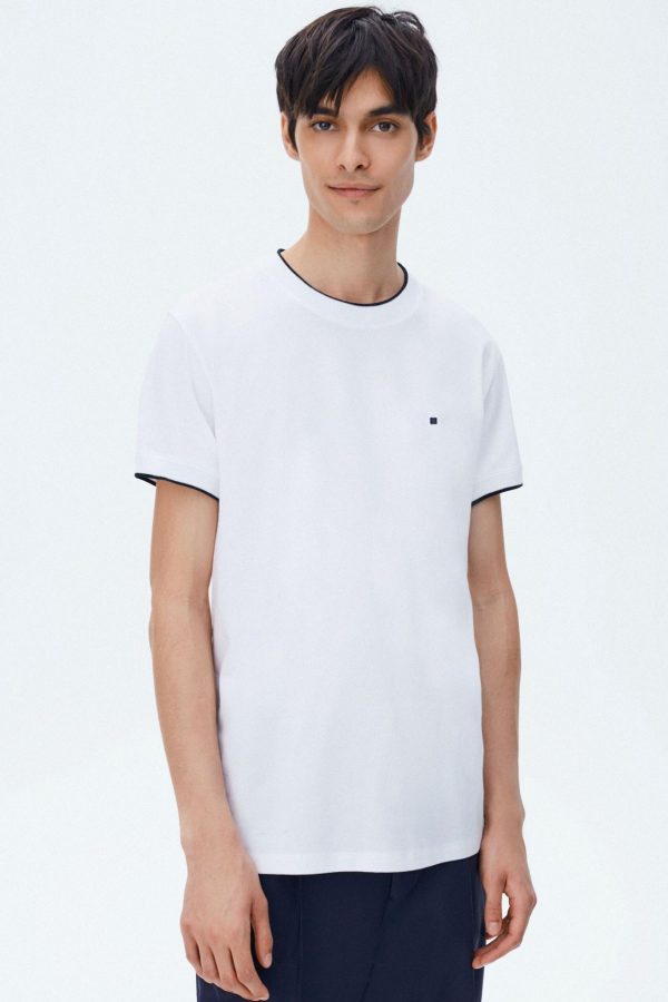 Camiseta básica regular fit en algodón liso. Cuello redondo y manga corta con ribetes a contraste. Detalle de logo de cubo bordado en el pecho. El modelo mide 187 cm y lleva una talla S.