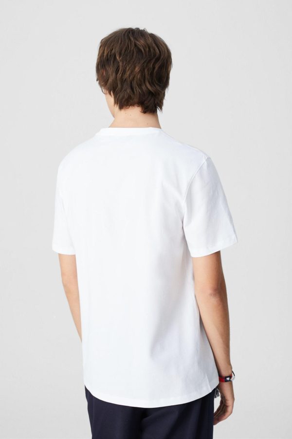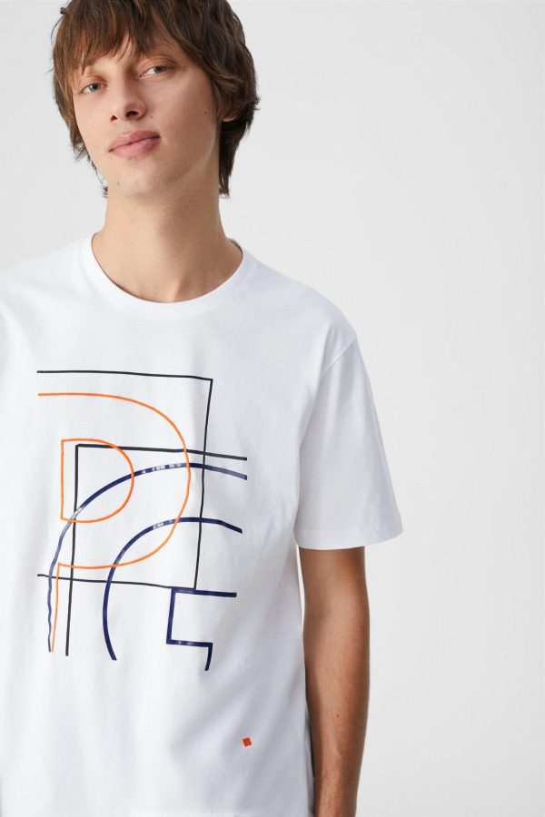Camiseta regular fit en algodón con estampado engomado de PG geométrico. Tapacosturas a tono en el interior del cuello y detalle de cubo PG bordado en el bajo. El modelo mide 188 cm y lleva una talla M.