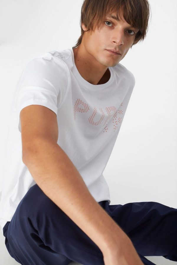 Camiseta regular fit en algodón con estampado de PURE. Detalle de tapacosturas a tono en interior del cuello. El modelo mide 186 cm y lleva una talla M.