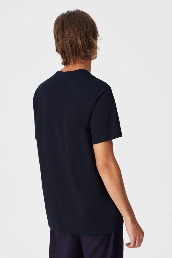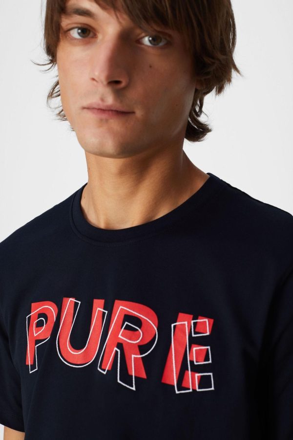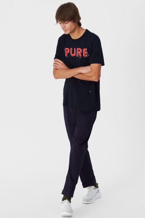 Camiseta regular fit en algodón con estampado PURE. Detalle de tapacosturas a tono en interior del cuello. El modelo mide 186 cm y lleva una talla M.