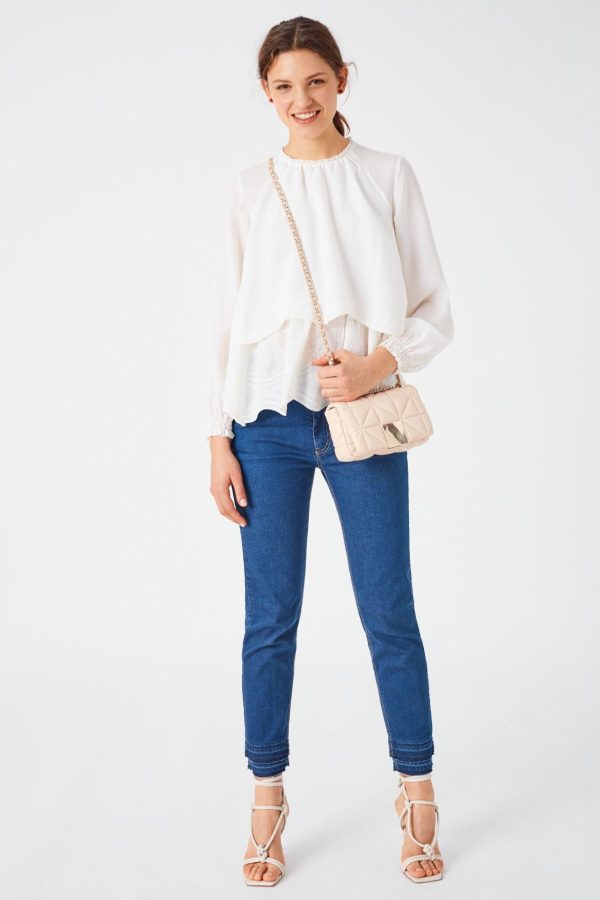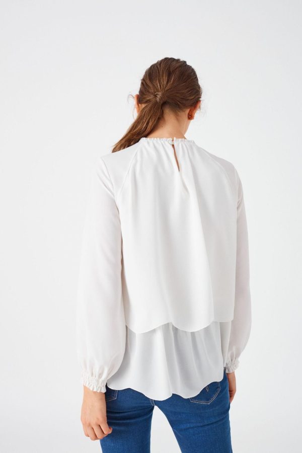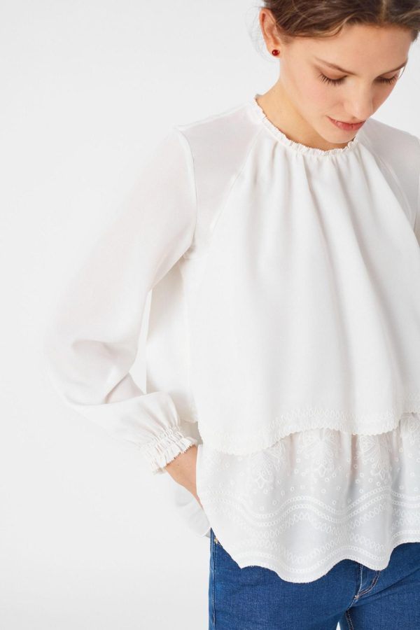 Blusa fluida en crepé con doble capa y detalle de bordados a tono en el bajo. Escote caja fruncido y manga abullonada. La modelo mide 1.78 m y lleva una talla S.