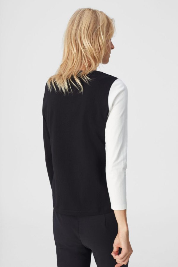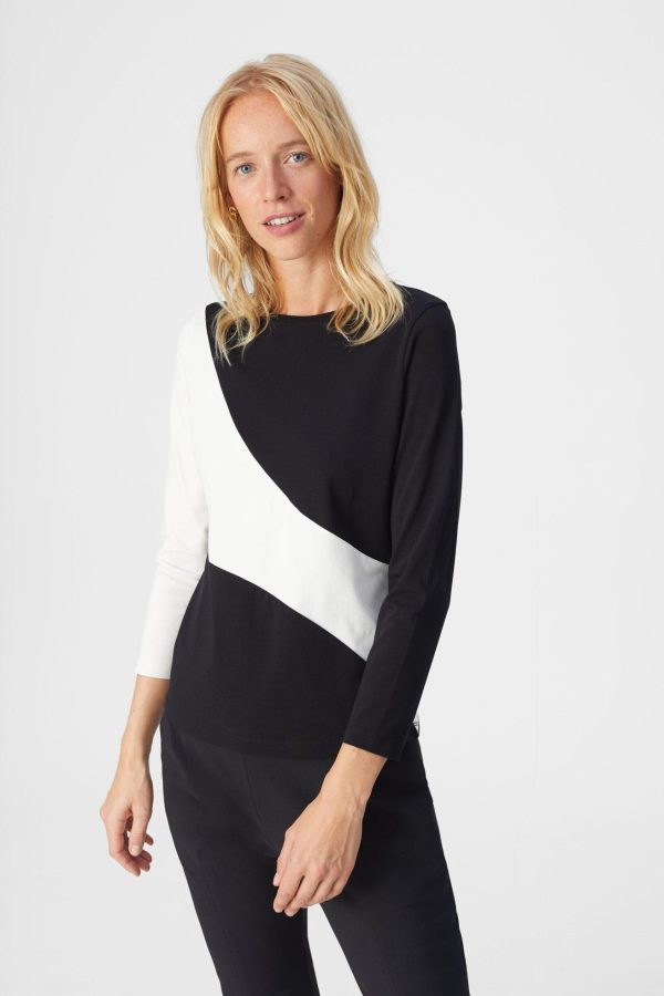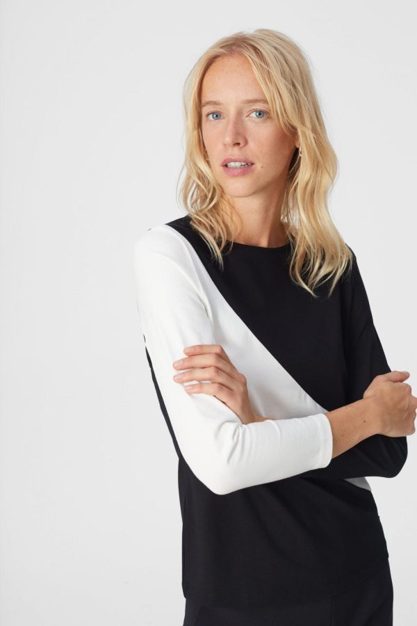 Camiseta ajustada en algodón stretch con diseño asimétrico coloblock . Cuello redondo y manga larga. La modelo mide 180 cm y lleva una talla S.