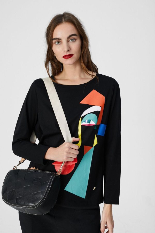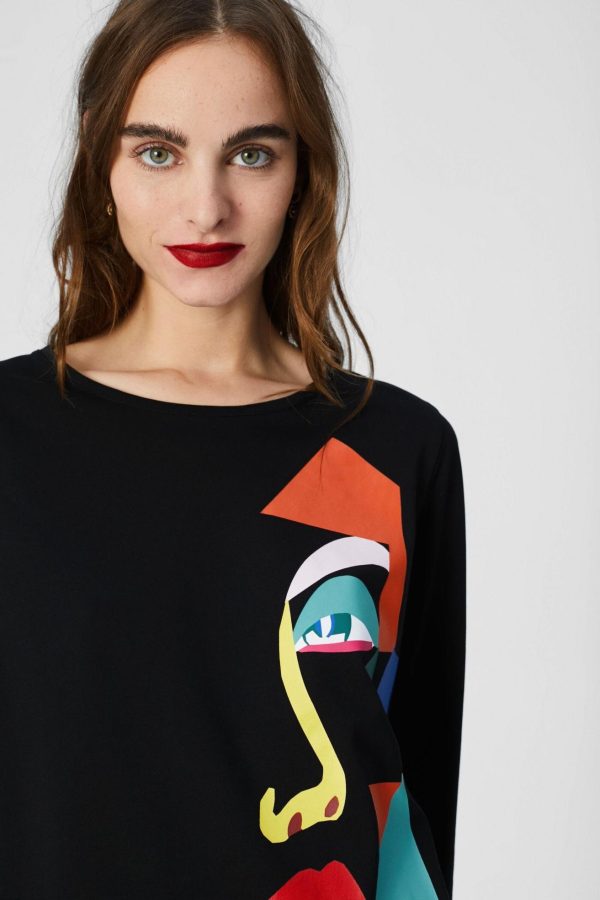 Camiseta ajustada en algodón stretch con estampado de rostro cubista. Cuello redondo y manga larga. La modelo mide 179 cm y lleva una talla S.