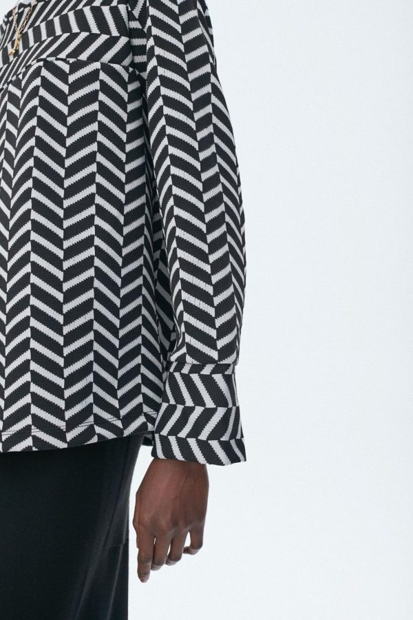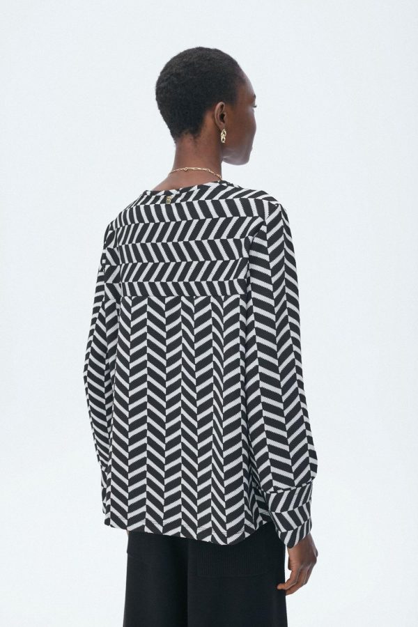 Camiseta recta en jacquard geométrico. Cuello redondo y manga larga. La modelo mide 176 cm y lleva una talla S.