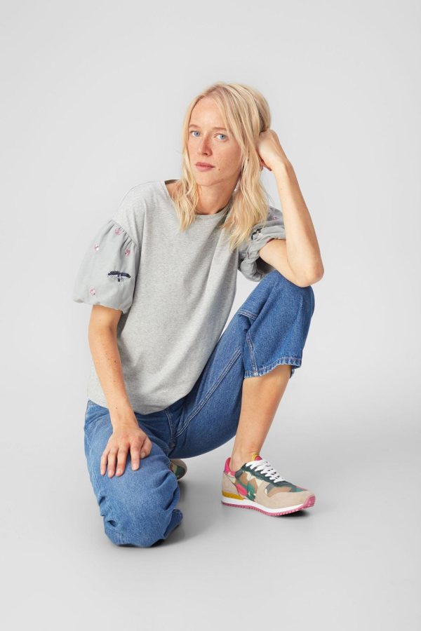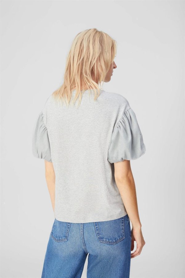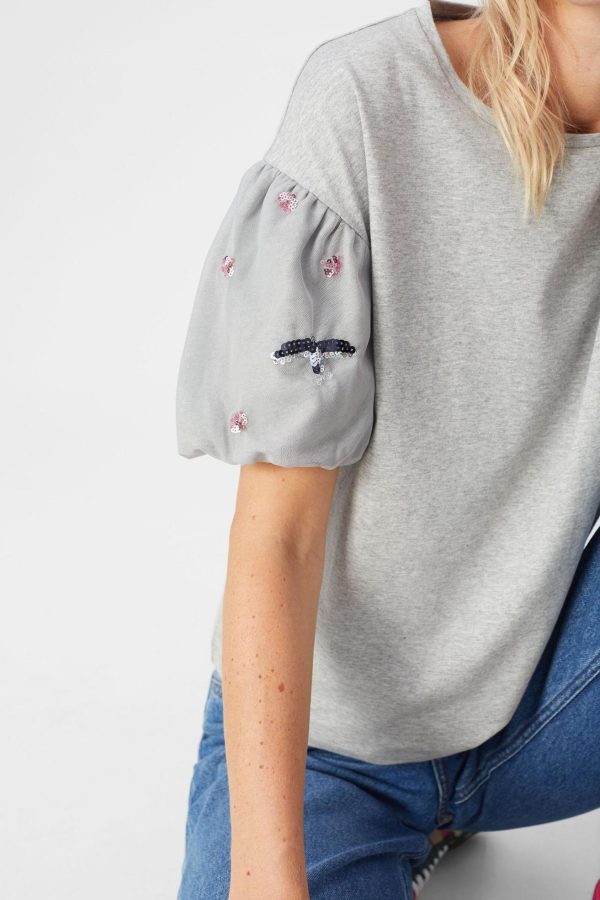 Camiseta entallada en algodón stretch con manga globo de tul bordado con lentejuelas. La modelo mide 180 cm y lleva una talla M.
