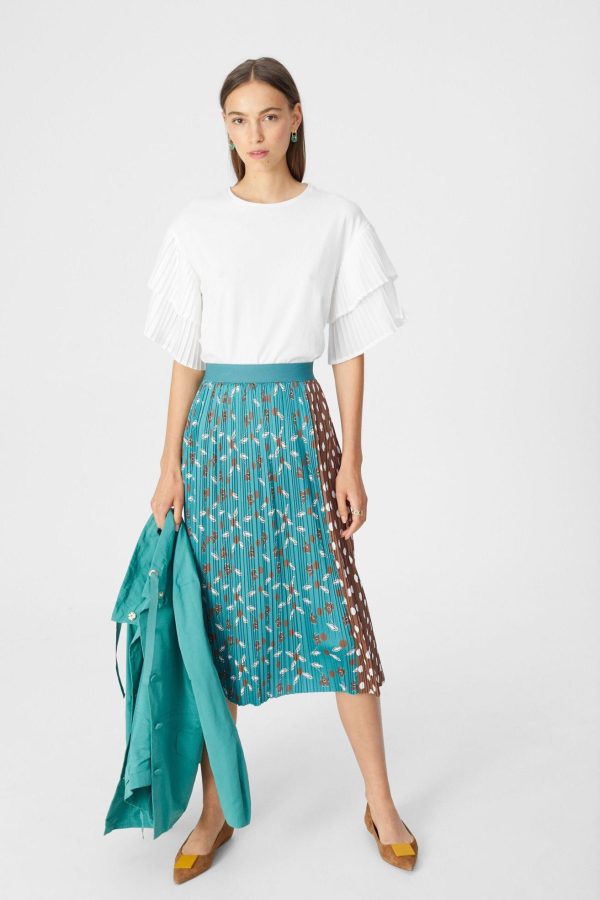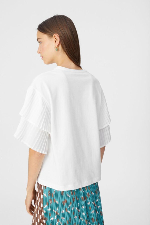 Camiseta recta en algodón stretch con mangas de crepé plisado. La modelo mide 180 cm y lleva una talla M.