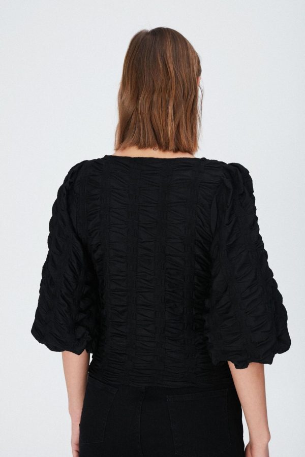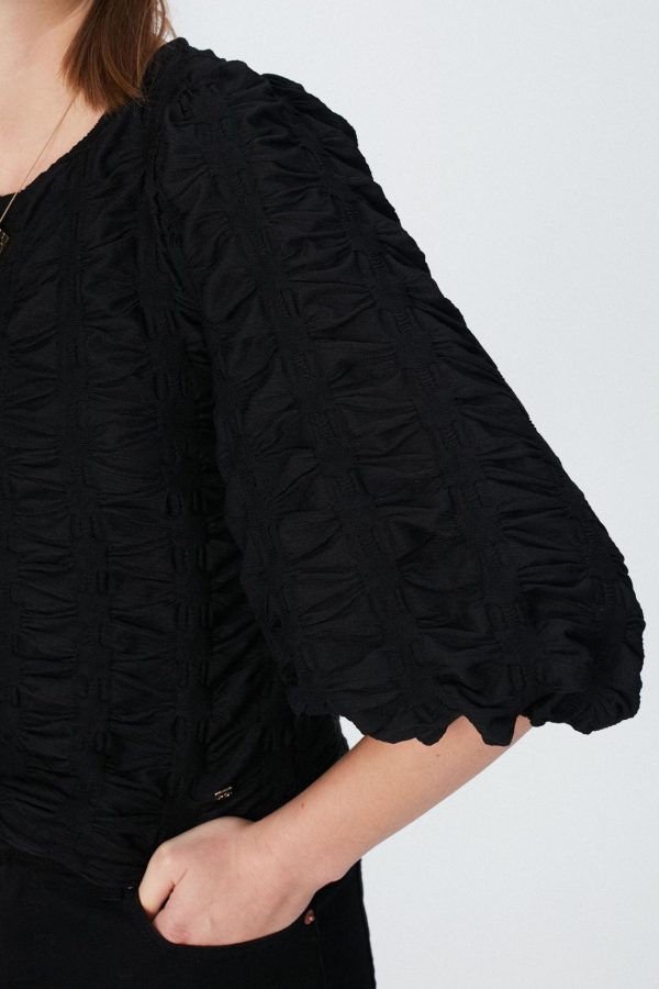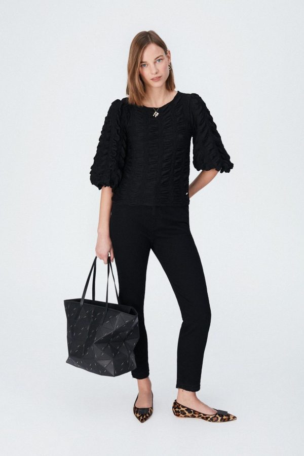 Jersey recto en punto stretch con manga corta abullonada y cuello redondo. La modelo mide 176 cm y lleva una talla S.