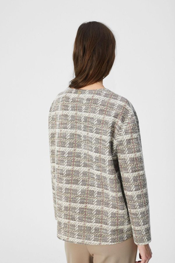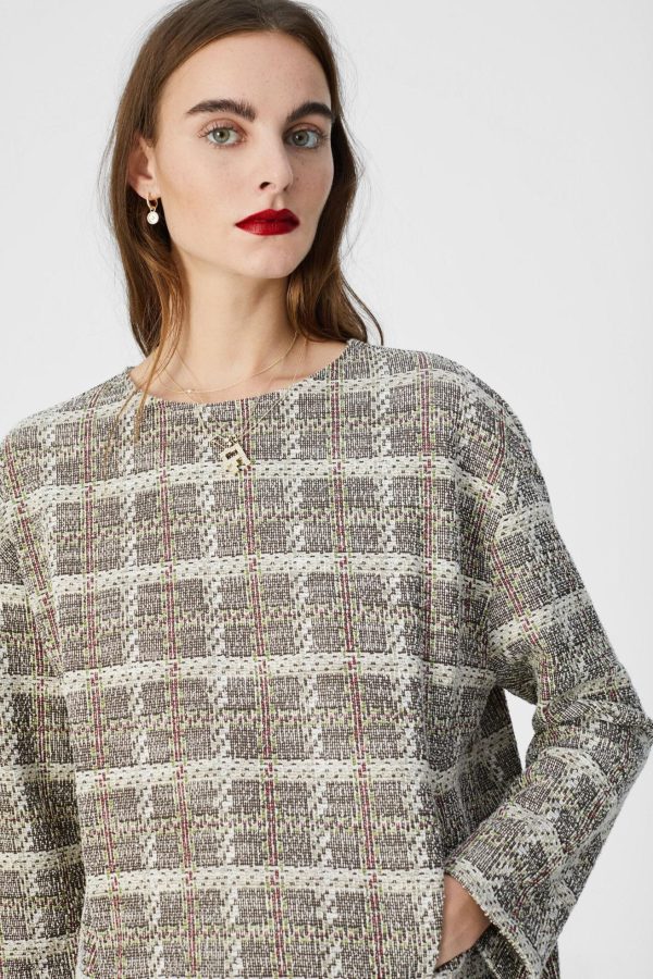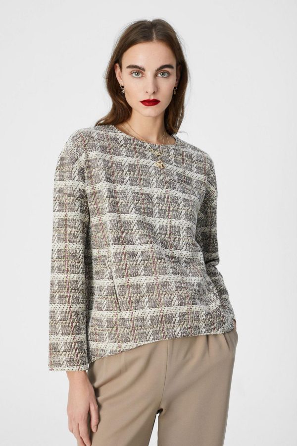 Top en tweed de cuadros con bolsillo canguro y bajo asimétrico. Cuello redondo y manga larga. La modelo mide 179 cm y lleva una talla S.