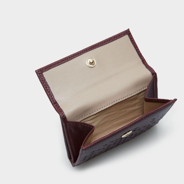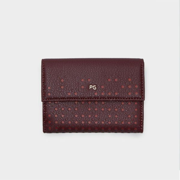 Cartera japonesa en piel con detalle de troquelados. Cierre de solapa, interior con billetera, monedero extraíble y 5 ranuras paratarjetas.