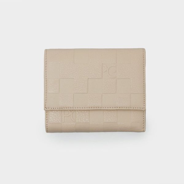 Cartera japonesa de piel grabada con Stamp Cubos PG. Cierre de solapa. Interior con monedero extraíble, billetera y 6 ranuras para tarjetas.