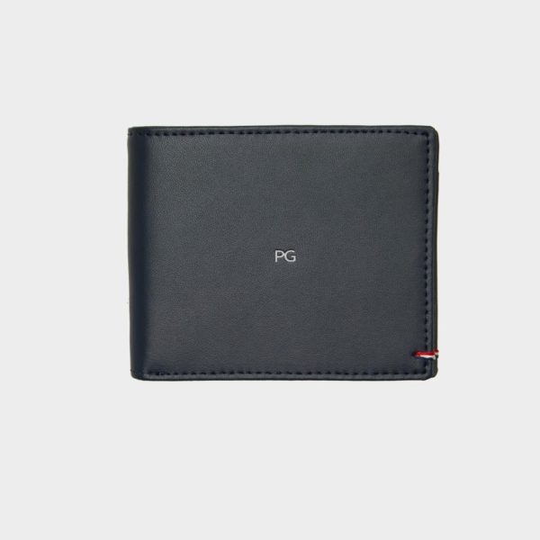 Cartera apaisada en piel con logo PG grabado y detalle de etiqueta en hilo bicolor. Interior con monedero, billetera simple y 3 ranuras para tarjetas.