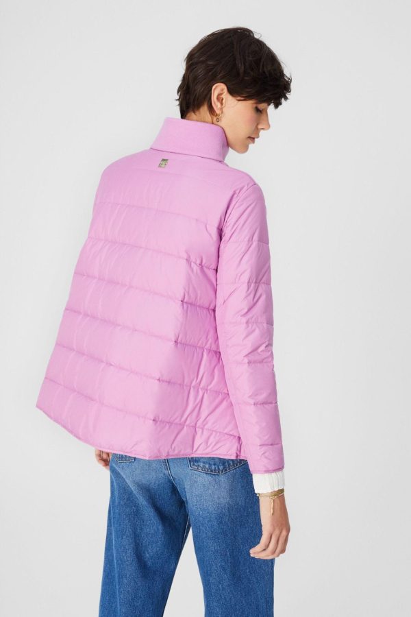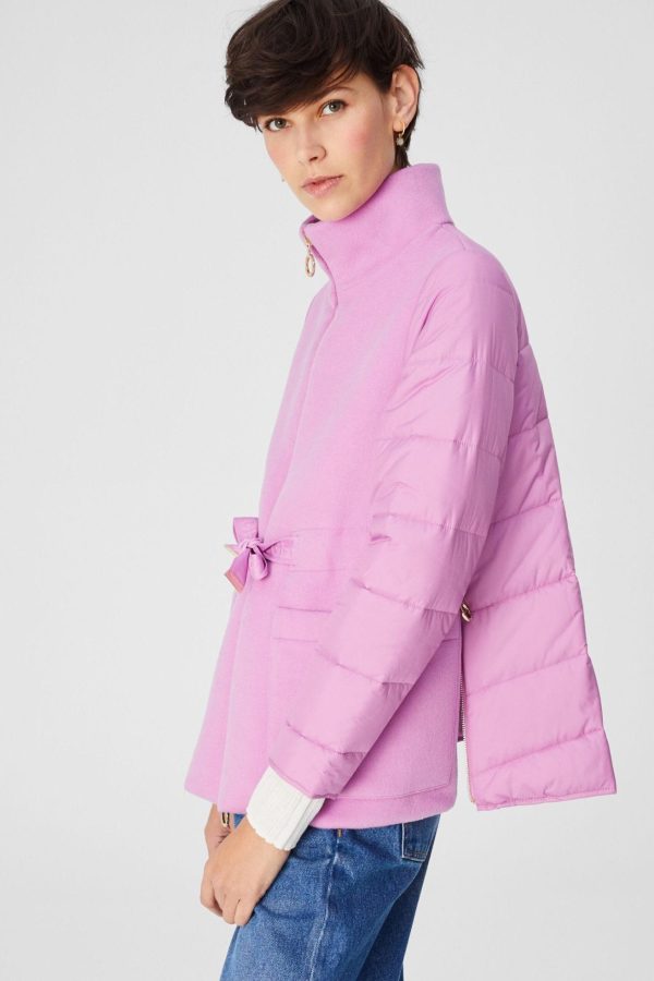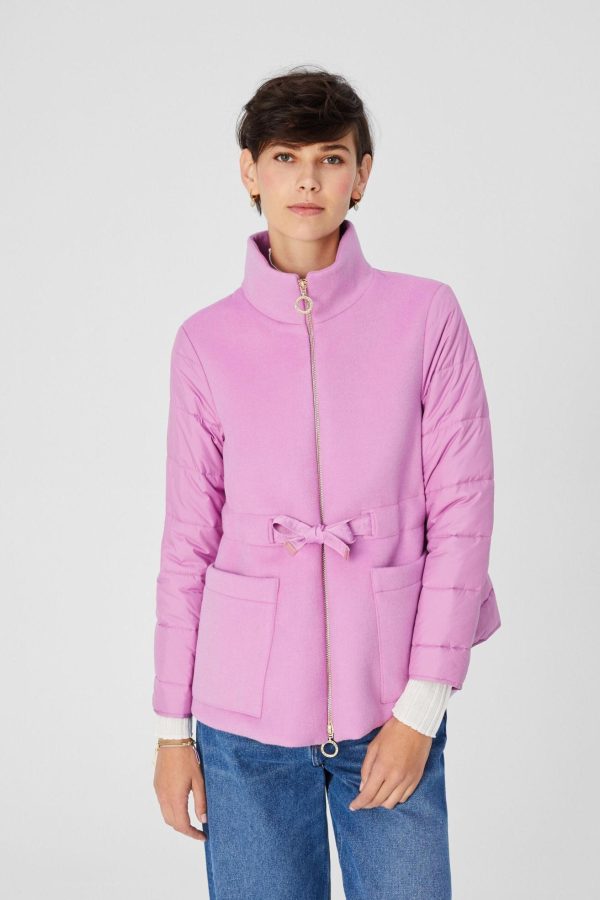 Cazadora evasé en doble faz de mezcla lana con nylon acolchado en espalda y mangas. Aberturas laterales con cremallera y ceñidor en cintura. Cuello chimenea, cierre de cremallera de doble curso y dos bolsillos parche. La modelo mide 179 cm y lleva una talla S.