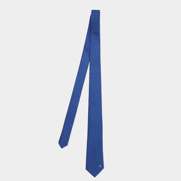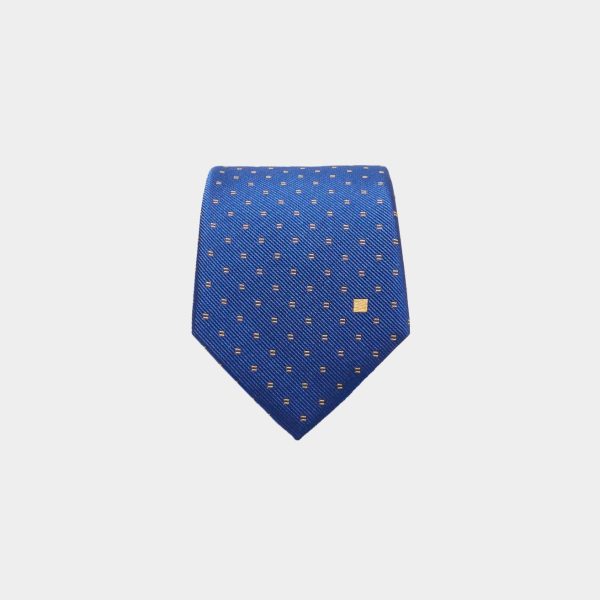 Corbata de seda con cubitos amarillos sobre fondo marino y logo cubo PG en la parte inferior.