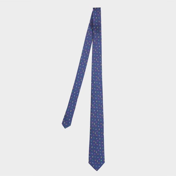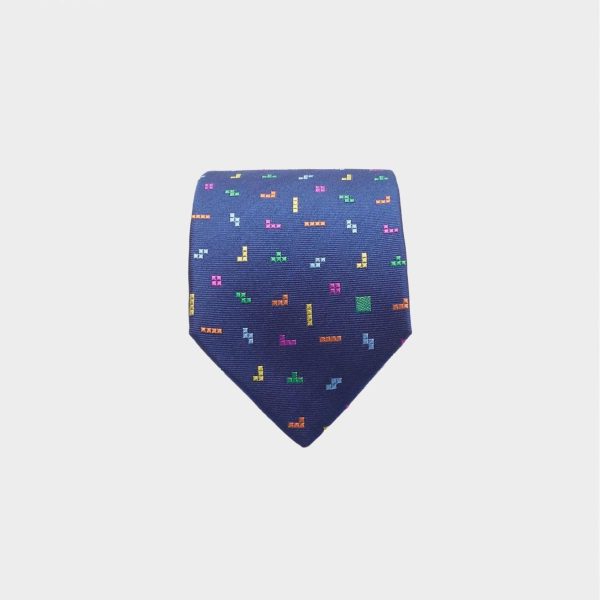 Corbata de seda con detalle de piezas de tetris multicolor sobre fondo azul marino.