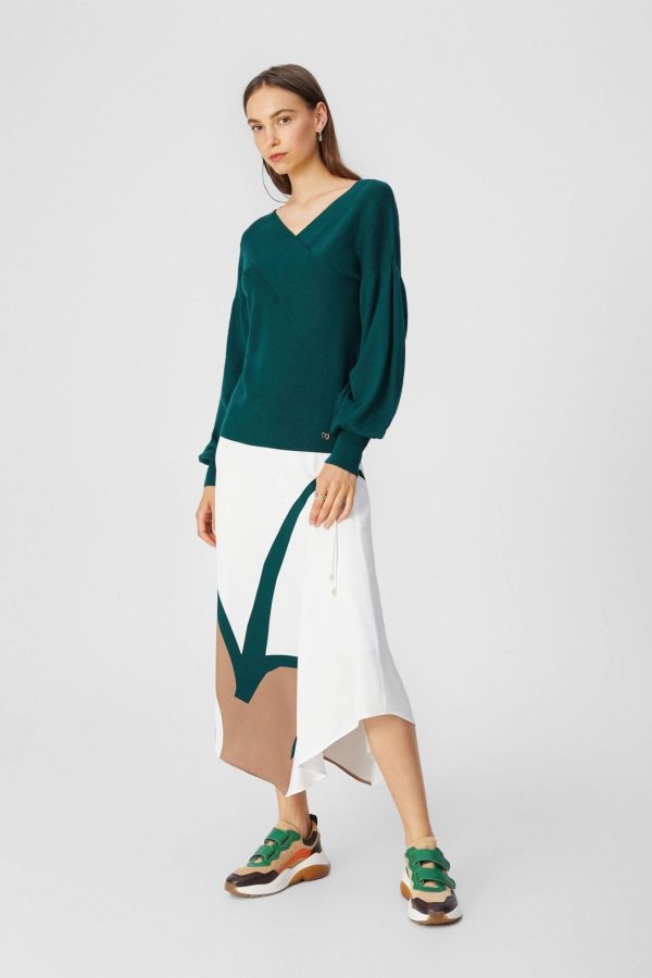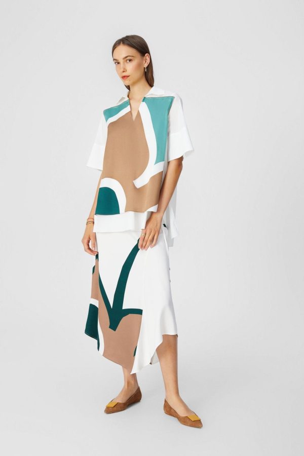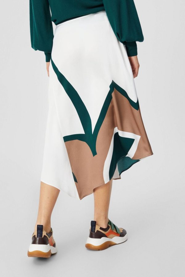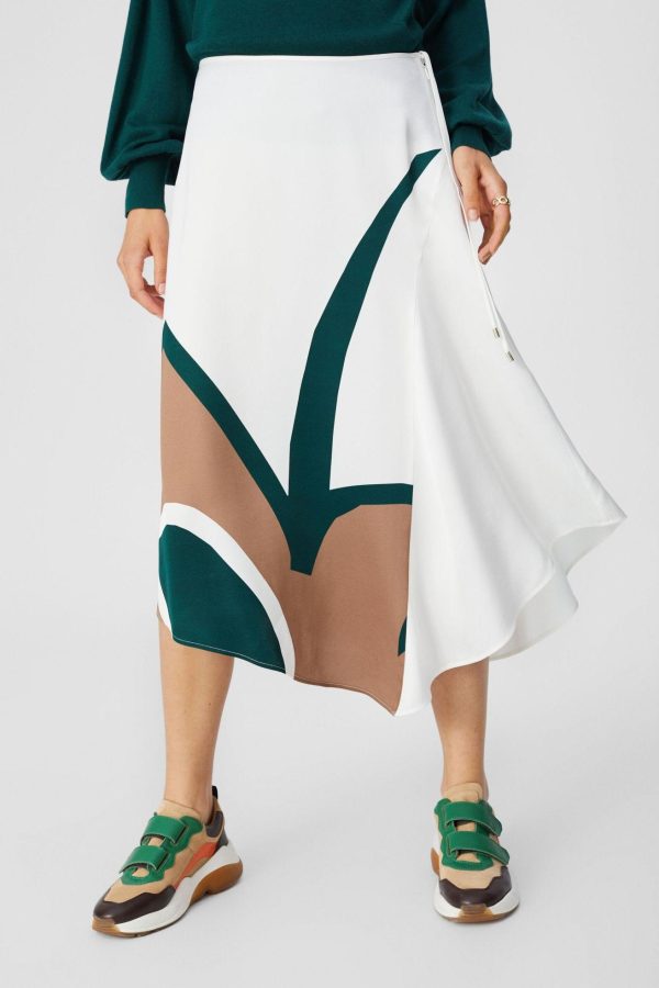 Falda fluida midi en viscosa estampada con diseño asimétrico. Cierre en lateral con lazada. La modelo mide 180 cm y lleva una talla 36.