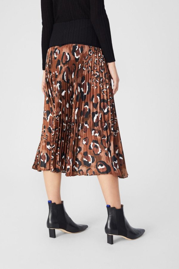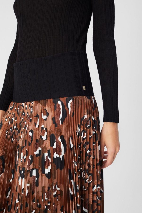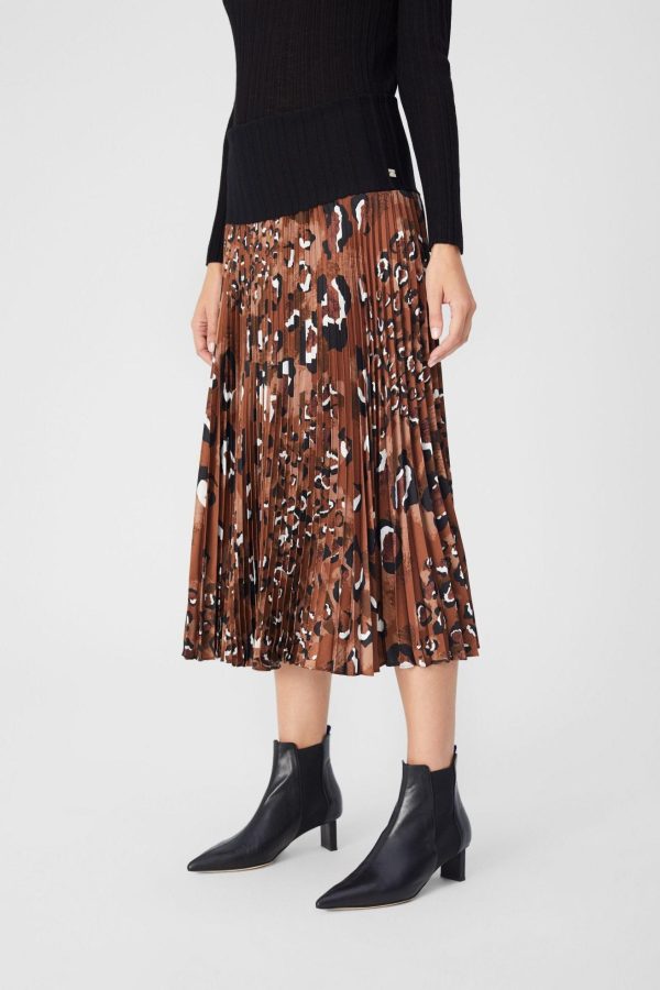Falda evasé de largo midi en twill plisado con diseño animal print. Caderín en punto con detalle de metálica PG. La modelo mide 179 cm y lleva una talla S.