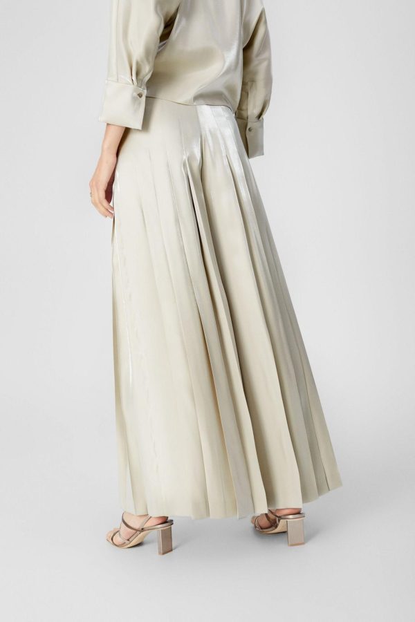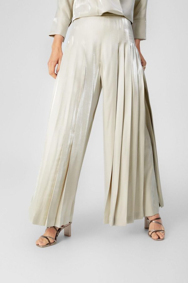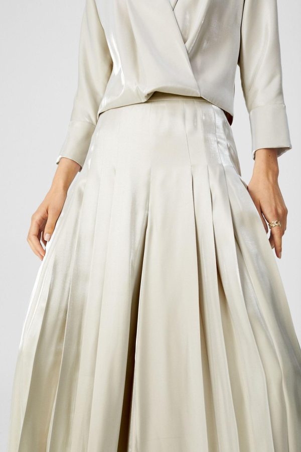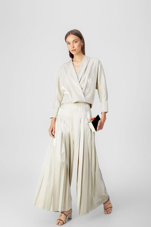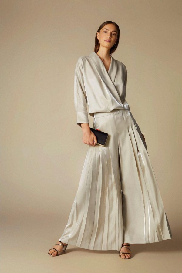 Falda pantalón en satén plisado. Tiene blusa a conjunto. La modelo mide 180 cm y lleva una talla 38.