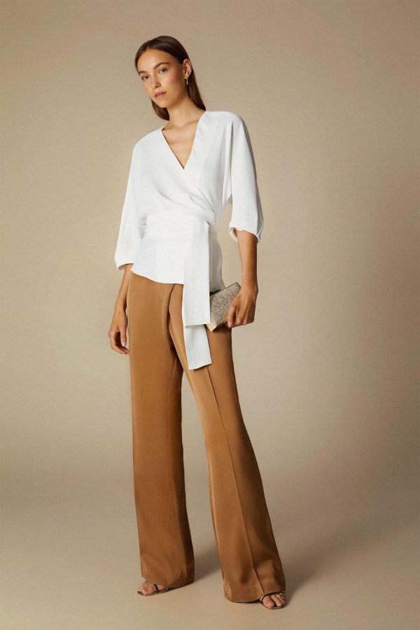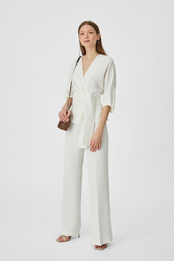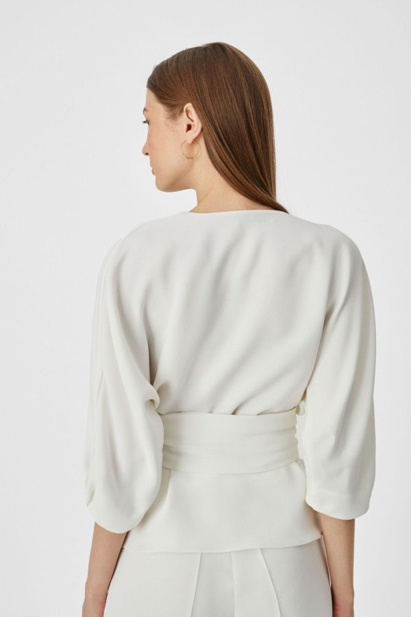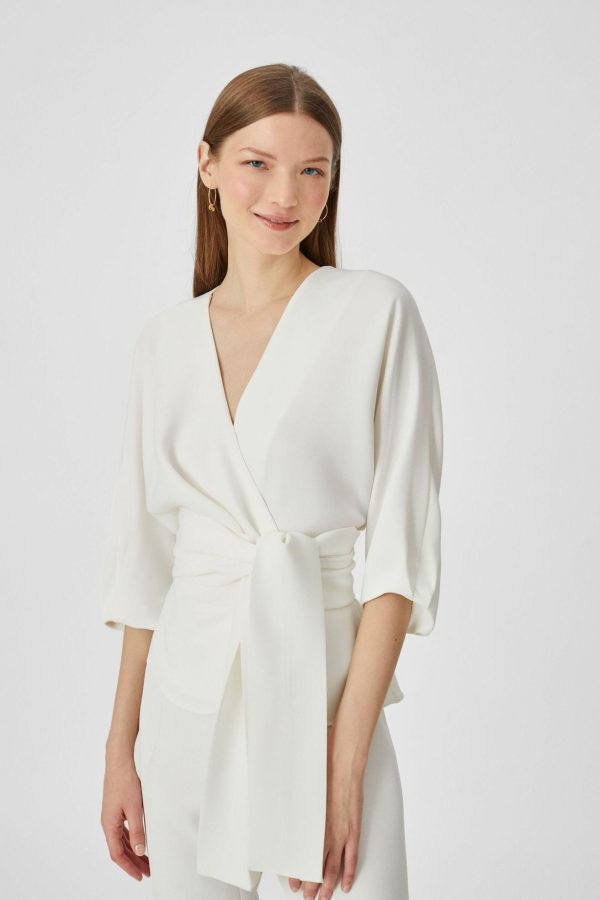 Top cruzado cache-coeur en cadí marfil con manga japonesa abullonada tres cuartos y lazada efecto cinturón. La modelo mide 180 cm y lleva una talla 38.