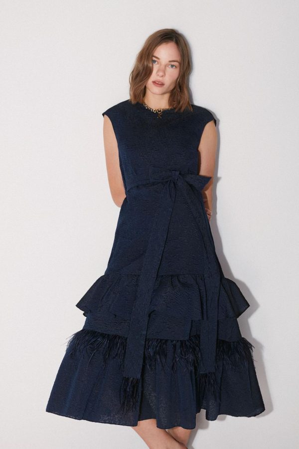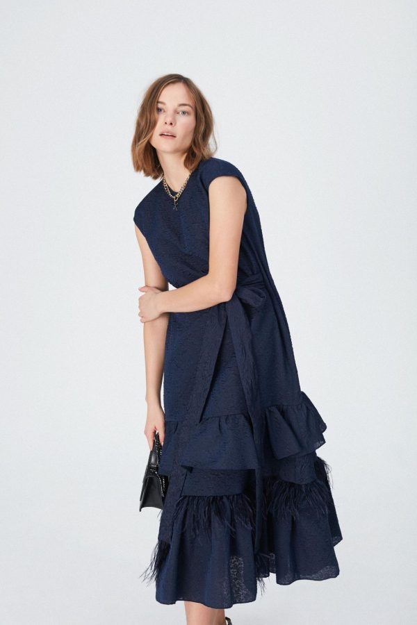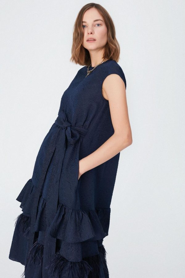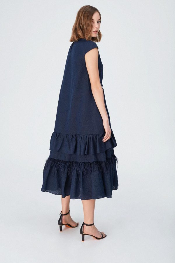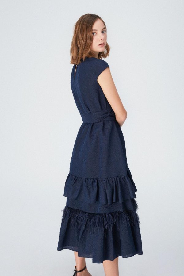 Vestido midi evasé en cloqué con volantes en el bajo y detalle de plumas de avestruz. Cinturón en el mismo tejido para entallar parte delantera. Cuello redondo, manga corta y bolsillos laterales. La modelo mide 176 cm y lleva una talla S.