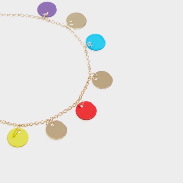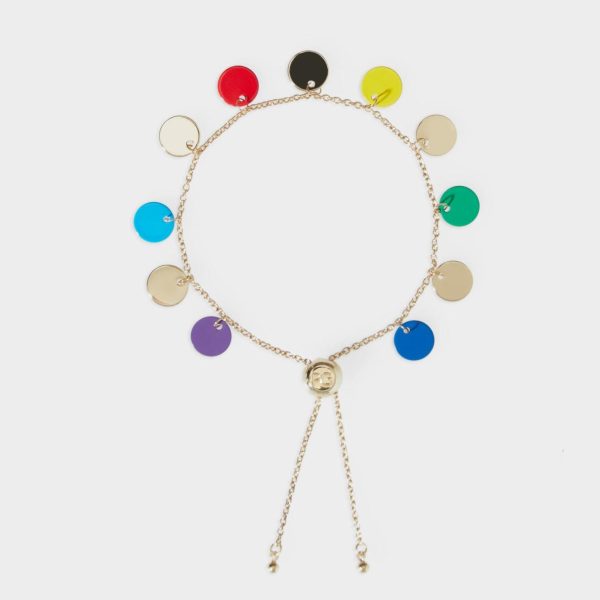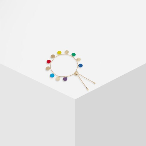 Pulsera bañada en oro con colgantes en forma de disco con esmaltado multicolor. Cierre regulable.