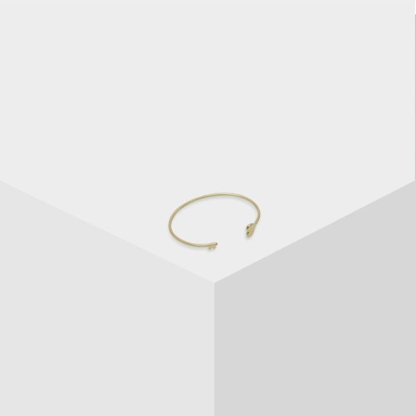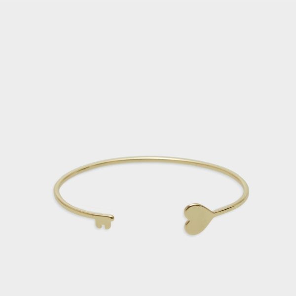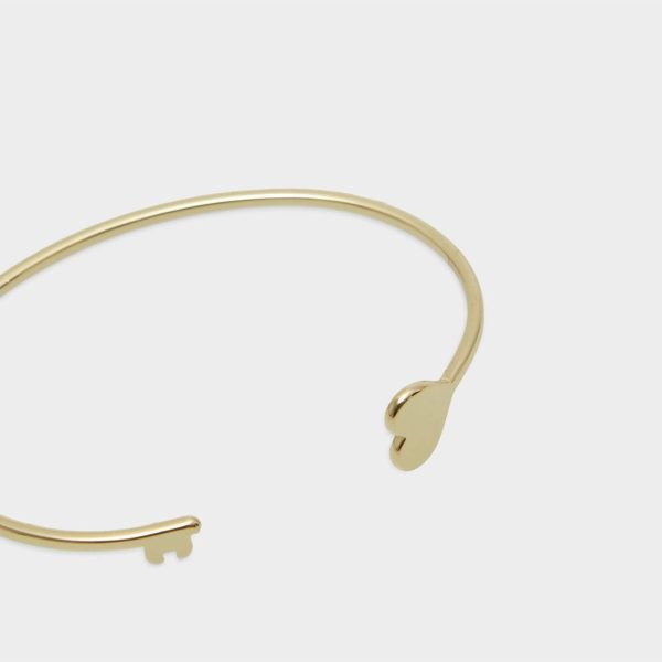 Pulsera rígida abierta y ajustable bañada en oro. Detalle de corazón en un extremo y de cerradura en el otro.