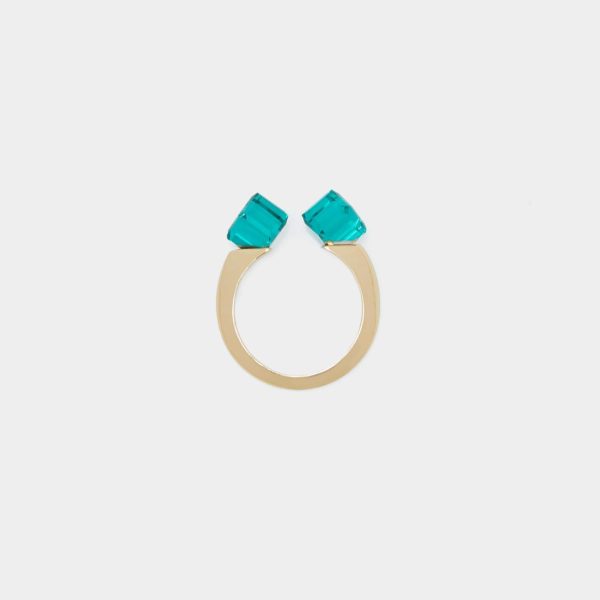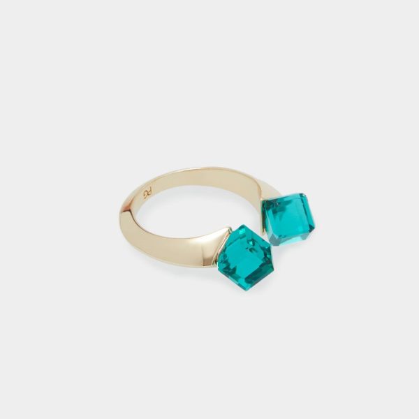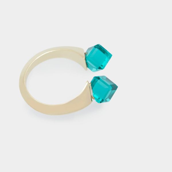 Anillo bañado en oro con detalle de cristales en forma de cubo en los extremos.