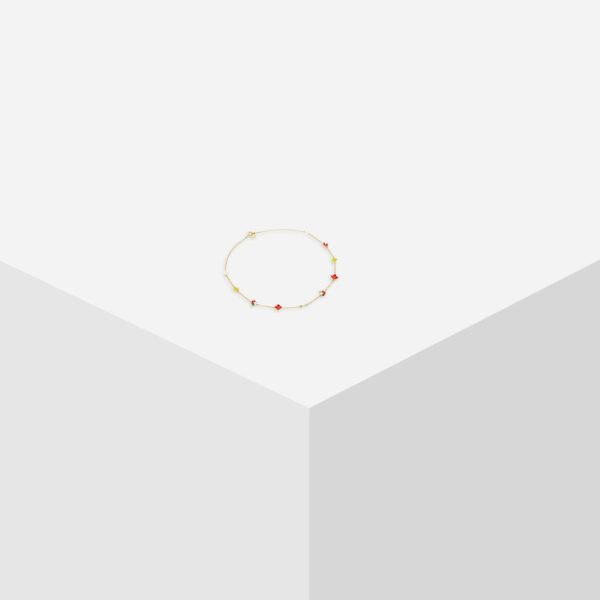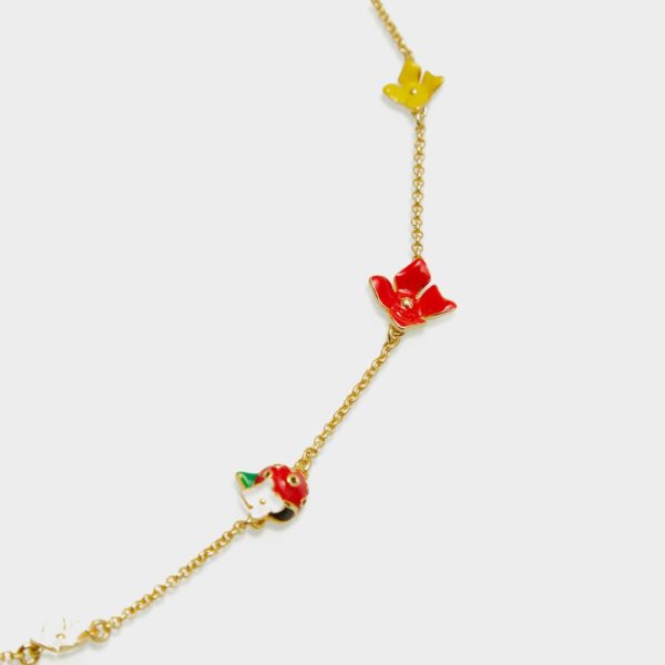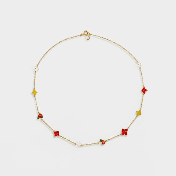 Collar corto bañado en oro con colgantes esmaltados de flores Garden y catarinas. Cierre de mosquetón personalizado.