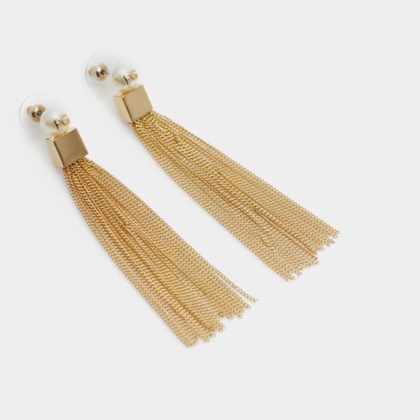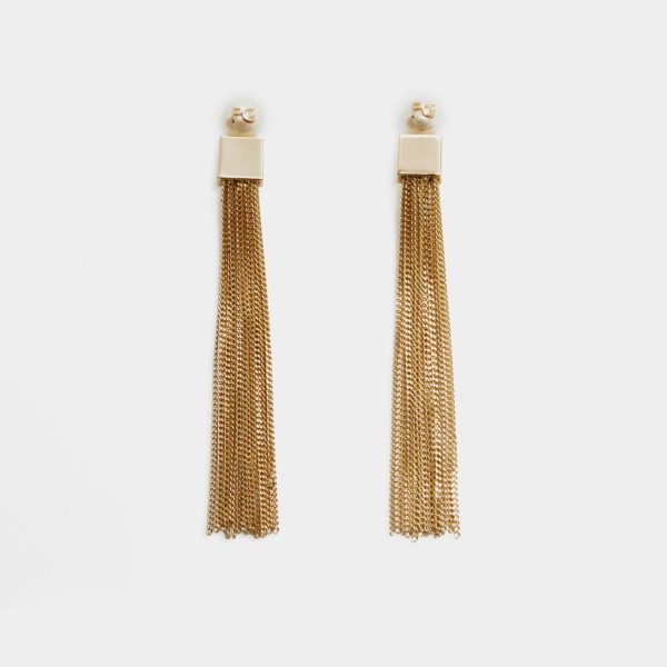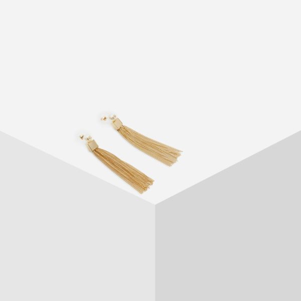 Pendientes largos bañados en oro con detalle de cubo y perla PG yflecos largos. Cierre de tuerca.