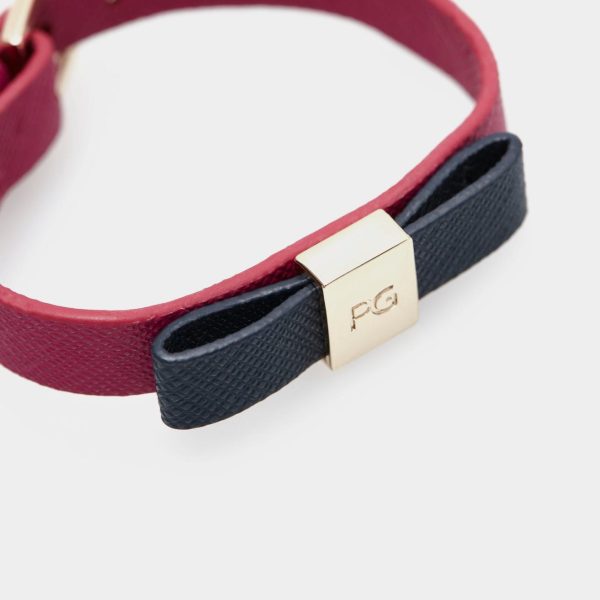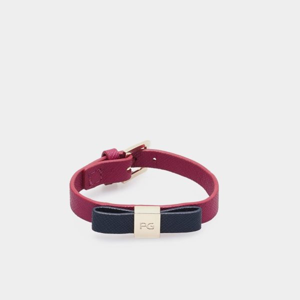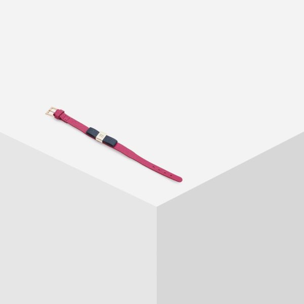 Pulsera de piel con detalle de lazo y cubo logotipado en metálicas color oro chiaro.