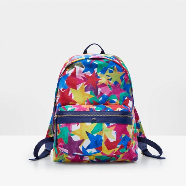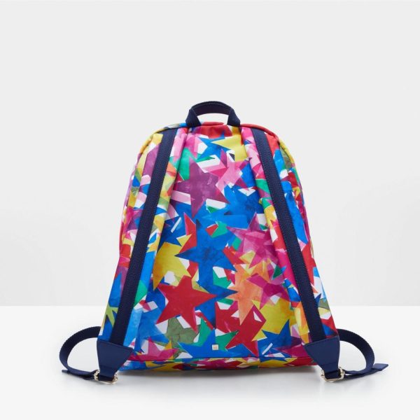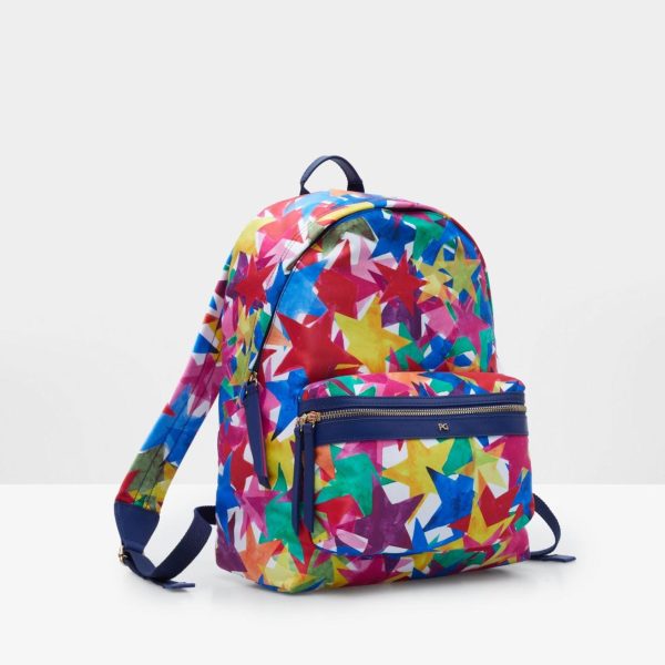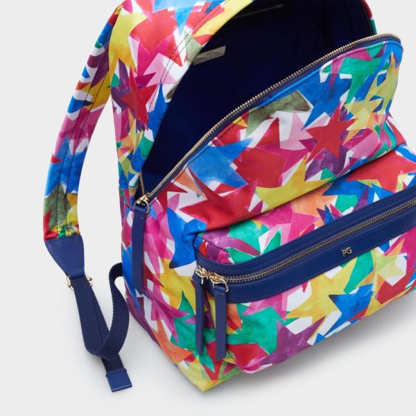 Mochila en raso con estampado “Lluvia de estrellas”. Bolsillo exterior con cremallera y metálicas PG. Asas de hombro ajustables y asa de mano en la parte superior.