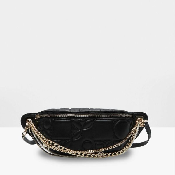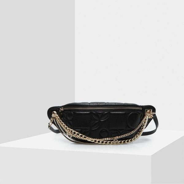 Riñonera en piel con acolchado Pop Iconos PG y detalle de cadenas y abalorios efecto perla. Cinturón ajustable y cierre de cremallera. Forro interior.